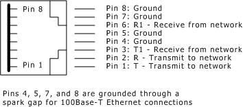 The following illustration shows the pinouts of the RJ-45 Ethernet interface: