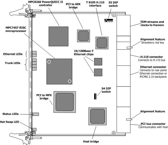 The TX 4000C CompactPCI board provides eight T1 or E1 digital trunk interfaces. The TX 4000C design is based on an intelligent communication processor (CP) that plugs into a single CompactPCI bus slot. The CP operates with the CompactPCI bus host processor to form a distributed communications application platform.