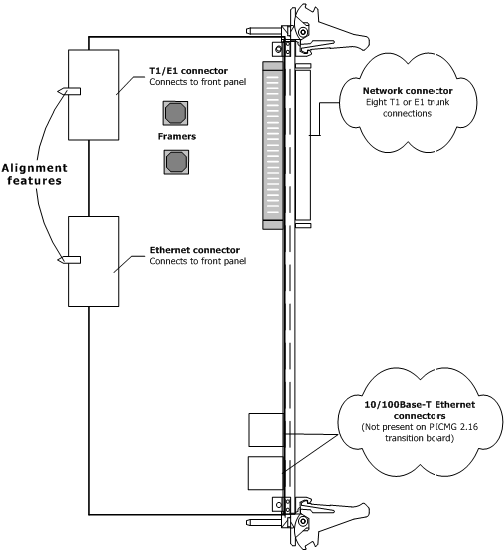 The following illustration shows the location of the main components on the rear I/O transition board. The transition board is attached to the TX 4000C board and enables the board to support the T1, E1, and Ethernet functionality.