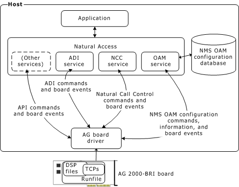 Several runfiles and DSP program files are installed with Natural Access. Specify the files to use for your configuration in the board keyword file. Refer to Using board keyword files for more information. When NMS OAM boots a board, the runfiles and DSP program files are transferred from the host into on-board memory. For more information about the DSP files shipped with Natural Access, refer to the ADI Service Developer's Reference Manual.