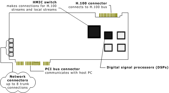 The AG 2000 board fully supports the H.100 bus specification. The H.100 bus enables boards to share data and signaling information with other boards on the H.100 bus. For example, you can connect two or more AG 2000 boards for applications that perform trunk-to-trunk switching. You can add additional DSP resources, analog station interfaces, or loop start line interfaces using other AG boards. You can also use MVIP compatible products from other manufacturers with the AG 2000 board.