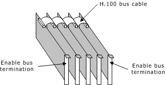 H.100 boards are connected to one another with an H.100 bus cable. The two boards located at the end of the H.100 bus must have bus termination enabled, as shown in the following illustration. Bus termination is controlled by a DIP switch.