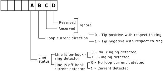 Depending on how the transmitted signaling A bit is set, the line has been placed on-hook or off-hook. Depending on the hook state, the received signaling A bit acts either as a ring signal detector or a loop current indicator. When the line is on-hook, monitoring the A bit tells you if the line is ringing. When the line is off-hook, monitoring the A bit indicates whether there is loop current flowing. The B bit indicates the polarity of tip and ring. If the B bit is set to 1, the loop current direction is reverse. Bits C and D are reserved, and should be ignored.