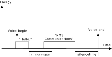 Voice begin can be triggered when the remote party begins speaking. Voice end occurs after an absence of voice for silencetime milliseconds. The following illustration shows call progress analysis voice detection: