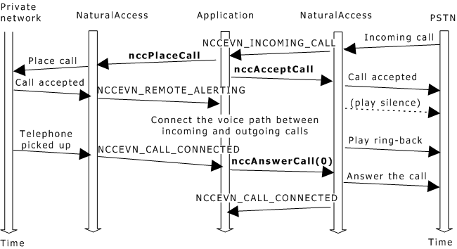 The call is put on hold by accepting the call with nccAcceptCall and outputting silence on the line and the outbound side of the application dials the received address. |