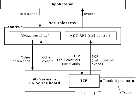 The NaturalAccess NaturalCallControl API (NCC API) enables an application to establish inbound or outbound calls and to perform call transfer, blocking, and other operations. To keep this API relatively simple and protocol-independent, the communication with the trunk is performed by another software entity called a trunk control program (TCP). The TCP translates commands from the NCC API into channel associated signaling (CAS) appropriate for the particular protocol running on the trunk, and translates protocol-specific trunk events into NCC API events.