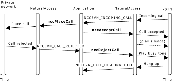 The way a gateway application rejects calls is similar to the way it accepts calls. Initially, the TCP accepts the incoming call and puts it on hold by sending silence to the line. When the outbound call is rejected, the application calls nccRejectCall. The TCP immediately starts to perform the action requested by nccRejectCall. It can play a busy tone, or let the application play a reject message. The TCP then relies on the caller side to tear down the connection.