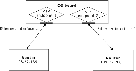 The following illustration shows the relationship between the RTP endpoints and the CG board's Ethernet interface: