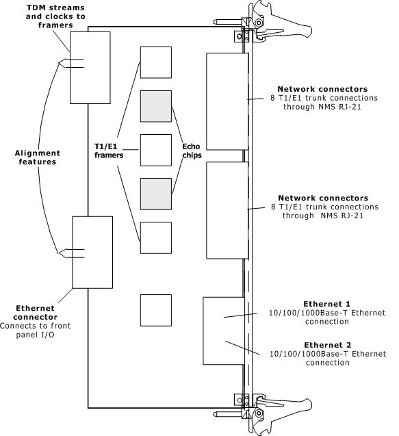 Configurations with a main board and attached daughterboard provide up to 16 T1 or E1 digital trunk interfaces and two Ethernet 10/100/1000Base-T interfaces.