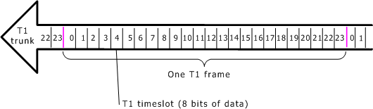 On T1 trunks, a frame consists of 24 timeslots, sent every 125 µsec (1/8000 sec). The following illustration shows a T1 frame: