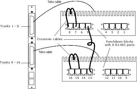 The following illustration shows the CG 6565C loopback configuration with two punchdown blocks connecting trunks 7 and 8, 15 and 16, as well as 5 and 13 using crossover cables: