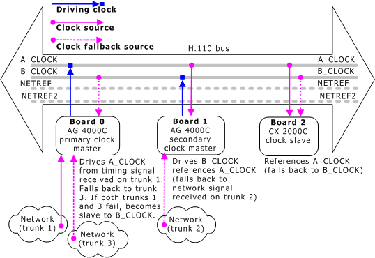 In this configuration, Board 0 is the primary clock master and drives A_CLOCK. All slave boards on the system use A_CLOCK as their first timing reference. Board 0 references its timing from a network timing signal received on its own trunk 1. Board 0 also uses the network timing signal from its own trunk 3 as its clock fallback source. This means that if the network timing signal derived from its own digital trunks fails, Board 0 continues to drive A_CLOCK based on the timing reference from trunk 3.