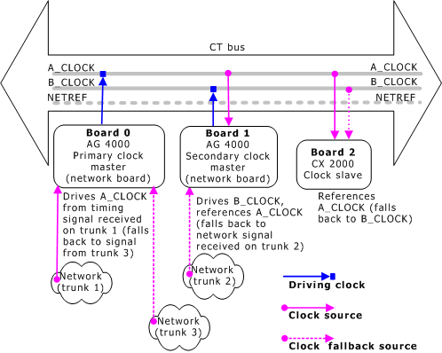 When multiple boards are connected to the CT bus, you must set up a bus clock to synchronize timing between them. In addition, you can configure alternative (or fallback) clock sources to provide the clock signal if the primary source fails.