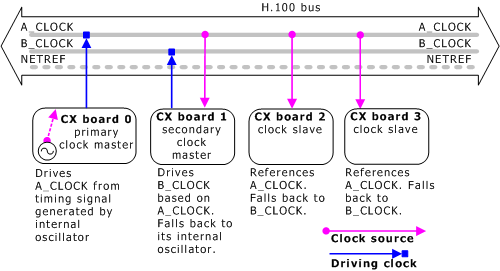 If another board has access to an outside clock signal, use this board as the clock master. CX 2000 boards are best used as clock masters only if none of the boards on the H.100 bus have any access to an outside digital clock signal (for example, if your system contains only boards with analog trunk interfaces). In this case, the CX 2000 board can drive A_CLOCK or B_CLOCK using its internal oscillator (OSC) as the timing reference. Refer to Examples for a sample system configuration with one CX 2000 board and two AG 4000 or AG 4040 boards.