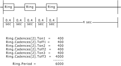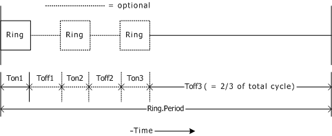 You can omit the third ring, or both the second and third rings, by setting their keywords to 0. However, Ring.Cadences[x].Ton1 and Ring.Cadences[x].Toff3 must always be set. Also, Ring.Cadences[x].Toff3 must always equal at least 2/3 of the total length of the cadence. This is so the ring phasing algorithm works correctly.