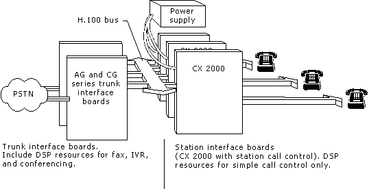 CX 2000 boards are station interfaces for Enterprise markets. They provide analog interfaces to analog devices such as telephones, fax machines, and modems within a private network. They can be used to build such systems as private branch exchanges, automatic call distributors, and IP-PBXs.