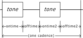 To start the transmission of a tone, invoke cdiStartTones. In the invocation, pass a pointer to the CDI_TONE_PARMS structure. The following illustration shows how the parameters in CDI_TONE_PARMS determine the cadence: