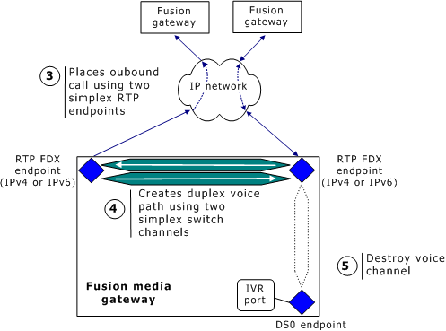 If the gateway is successful in placing the outbound call, it creates two RTP switching channels to connect the original RTP endpoint with an RTP duplex endpoint associated with the outbound call. These endpoints can be IPv4 endpoints, IPv6 endpoints, or a combination of both. |