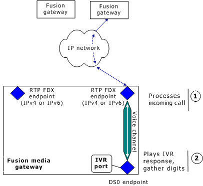 The media gateway connects the user to an interactive voice response (IVR) port through a voice channel and DS0 endpoint. The application then uses voice message prompts to elicit the number that the user wants to call.