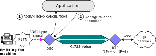 The MSPP DS0 endpoint (through its echo canceller functionality) detects an ANS-type signal from the PSTN network it and sends an ADIEVN_ECHO_CANCEL_TONE event to the application. |