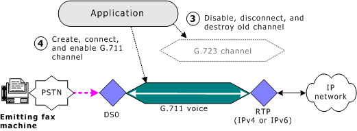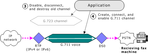 The application disables, disconnects, and destroys the current MSPP channel (G.723 in the illustrations). |