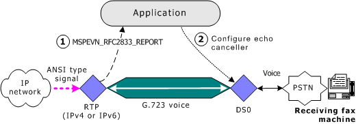 The remote gateway is informed of the occurrence of an ANS family signal when it receives an RFC 2833 packet containing a specific ANS signal identification. When it receives this packet, the remote gateway transitions into a G.711 clear channel and configures the echo canceller appropriately.