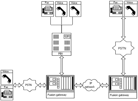 The following illustration shows two Fusion gateway systems transferring voice and fax data from one PSTN, over an IP network, to another PSTN: