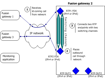 A gateway application (Fusion gateway 2) receives an incoming call through an RTP IPv4 or IPv6 duplex endpoint (shown as RTP1 in the example). |