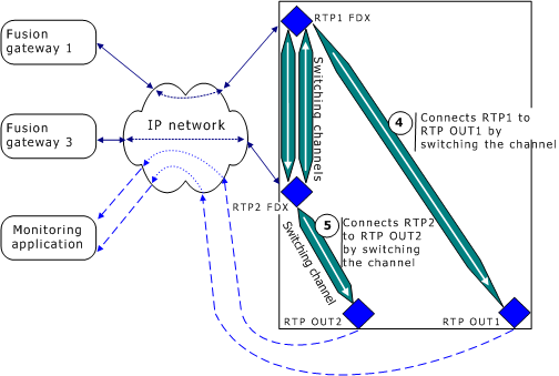 If the gateway is successful in placing the outbound call, it connects the incoming call (RTP1) with the outgoing call (RTP2) using two simplex RTP switching channels.