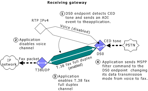 The application sends an endpoint filter command that switches the DS0 endpoint from voice to fax transmission mode. The T.38 full duplex channel regenerates the CED tone and sends it over the PSTN network (through the DS0 endpoint). |
