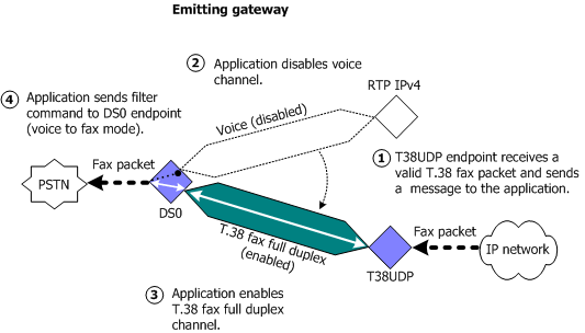 The following illustration shows the emitting gateway performing voice/fax switchover: