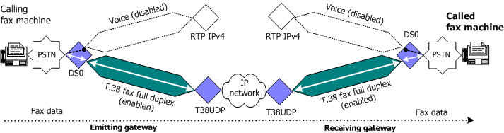 When the calling fax machine (connected to the emitting gateway) receives the CED tone, it begins to transmit fax data across the network. The T38UDP endpoint must be enabled to detect the arrival of T.38 fax packets.