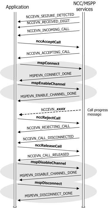 When receiving inbound calls, if the gateway application does not use nccAcceptCall, it still must wait for the MSPEVN_CONNECT_DONE event before answering the call with nccAnswerCall. In this case, however, the application cannot monitor the status of the call placed by the gateway at the other end of the network.