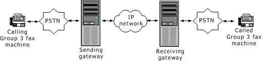 Fax relay transmissions occur in real-time. A calling fax machine places a PSTN call and is connected through a PSTN line to a gateway system. The emitting gateway demodulates the fax data and then relays the data to another receiving gateway (in packet form).