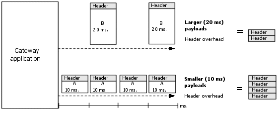 One way to decrease audio latency between the speaker and the listener in packet-based voice transmissions is to send smaller payloads of voice data. This reduces audible delay, but increases the number of packets that need to be transferred for a given voice data transmission. Since each of these smaller audio payloads requires a set amount of header information, the overall effect is to increase the total amount of data that the gateway must transmit.