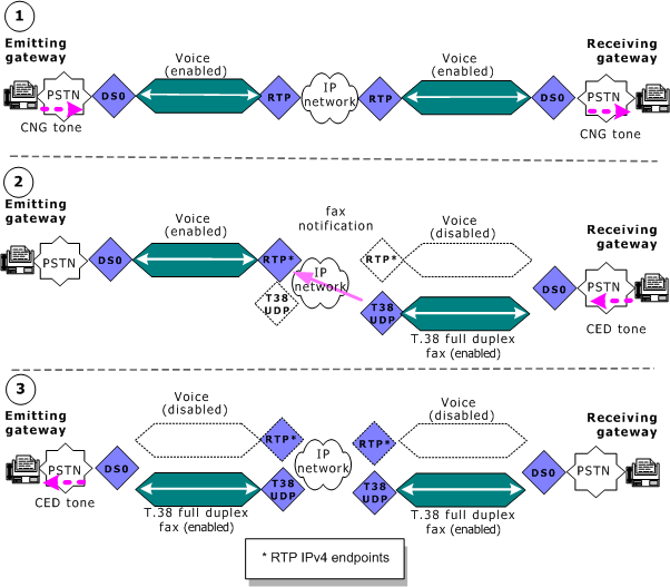 There are several ways to implement T.38 fax on Fusion systems so that the application can switch from voice transmission to fax transmission during the course of a phone call.