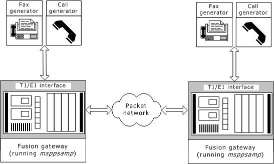 msppsamp requires two computers equipped with CG boards and connected over an IP network. Each system must include Fusion software and test equipment to place and receive calls (and, if necessary, transmit and receive fax data). The following illustration shows an overview of an msppsamp test environment: