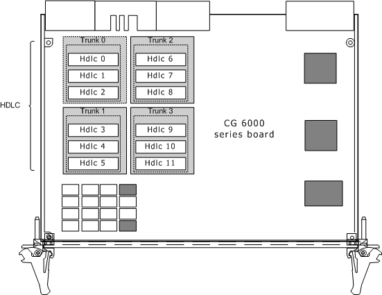 CG 6000 and CG 6000C boards use the on-board HDLC controllers to perform HDLC data processing. Each CG board T1 or E1 trunk is associated with a single framer instance. On CG 6000 and CG 6000C boards each framer instance is hard-wired to three HDLC instances.