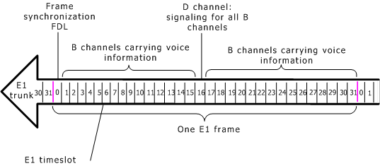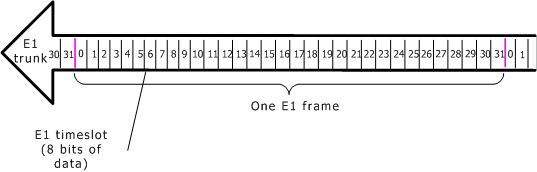 On E1 trunks, a frame consists of 32 timeslots. A frame is sent every 125 µsec (1/8000 sec):