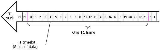 On T1 trunks, a frame consists of 24 timeslots, sent every 125 µsec (1/8000 sec).