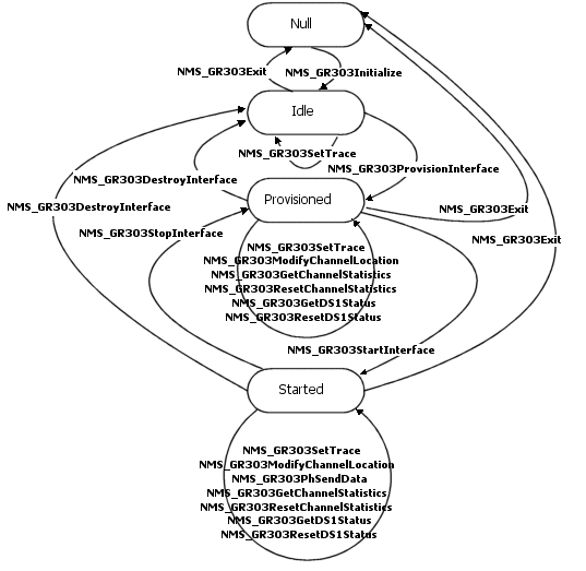 The following illustration shows state transitions for interfaces controlled by the NMS GR303 library. You must comply with the illustrated conditions when integrating NMS GR303 library functions into GR303 applications.