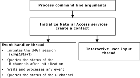 If you use an NFAS configuration, one context is allocated for each trunk in the NFAS group. If you use the -n option at the command line, the program reads the internally hard-coded context structure. imgtdemo then spawns the user-input thread (UserInput) and the event-handler thread (RunDemo).