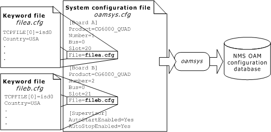 NMS OAM system configuration files contain a list of boards in the system and the name of one or more board keyword files for each board. See Creating a system configuration file for oamsys. |
