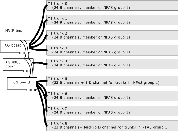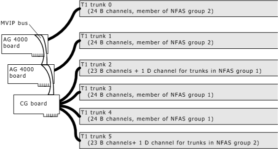 A single NFAS group can contain trunks from multiple boards, as shown in the following illustration: