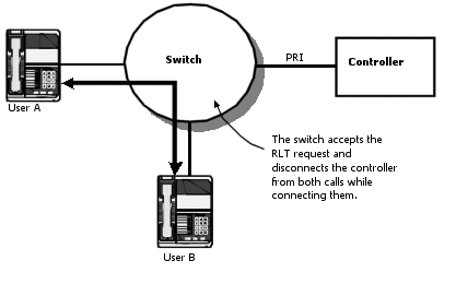 RLT enables a controller on a PRI to request that the switch connect two independent calls. The two calls can be served by the same PRI trunk or by two different PRI trunks that both serve the application, as shown in the following illustration: