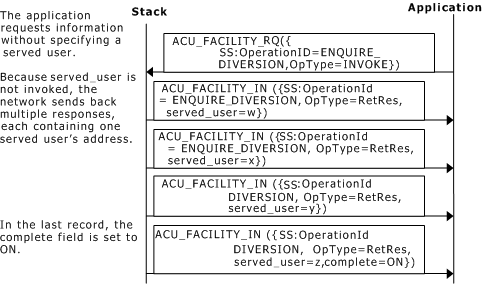 If the served_user field is not invoked, the network responds with one or more acu_ss_enquire_divert_ret_result extended data structures. Each structure contains the address of one served user that has call diversion activated.