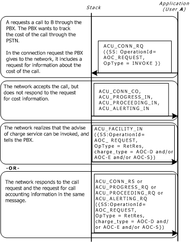If AOC services are not provided using a subscription service, they must be invoked to be used. Invocation of the services at the originating node is accomplished on a per-call basis. To invoke AOC services, an ACU_CONN_RQ primitive is sent to the stack, containing an acu_ss_aoc_request_invoke extended data structure.