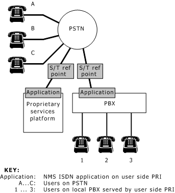 The following illustration shows a sample network and the points where an NMS ISDN ETS 300 supplementary service application can interface with the network. As shown in the illustration, an NMS ISDN application written for the ETS 300 variant interfaces with the network on the user side of the S/T reference point of a CEPT E1 PRI ISDN trunk.