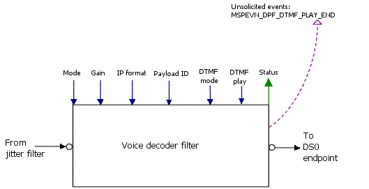 Decodes voice data according to a particular algorithm. Parameters within the decoder filter, such as payload ID, IP format and gain, can be altered through filter commands. Decoder filter status information can also be obtained through filter queries. For information about voice encoder filter parameters, refer to Voice channel parameter structures.