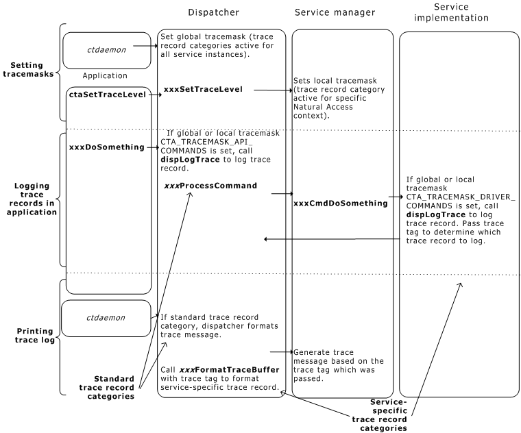 As shown in the following illustration, the application determines which trace record categories are logged. The dispatcher handles standard trace record categories (for example, logging service API function calls). Service-specific trace record categories (for example, logging driver calls) must be checked and generated by the service.